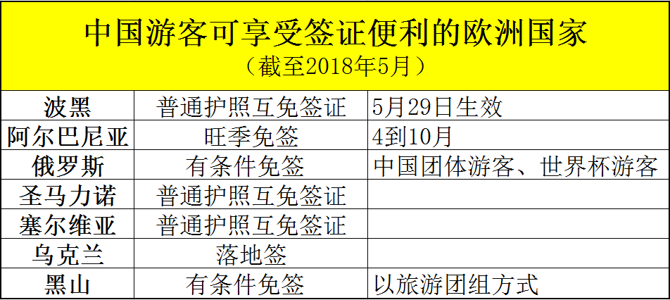 签证方面,今年对中国游客给予入境便利待遇的欧洲国家达7个。阿尔巴尼亚宣布对中国公民实施旅游旺季免签(4到10月)。中国和波黑持普通护照公民互免签证将于5月29日正式生效。俄罗斯对中国团体游客和参观世界杯的旅游者免签。此前圣马力诺、塞尔维亚已经针对中国游客免签,乌克兰开放落地签。黑山对旅行社组团方式的中国游客有条件免签。