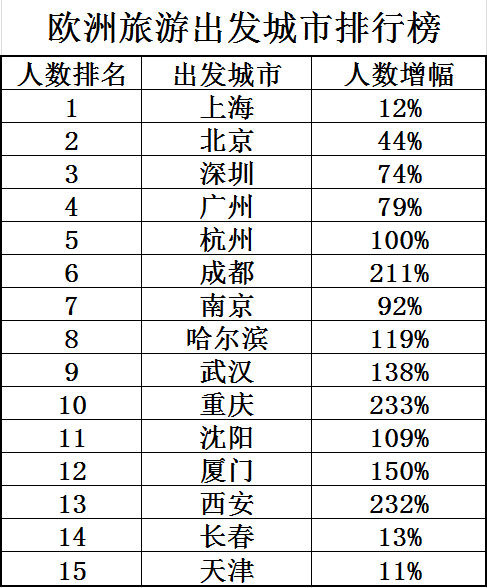 一线城市依旧是欧洲旅游的主要客源地,但相比去年同期,前四名变成“上、北、深、广”,深圳超过广州位居第三。增幅最快的则是成都、杭州、武汉、重庆、西安、厦门、沈阳、哈尔滨、南京等新一线城市,成为欧洲游的重要新兴口岸。携程欧洲游数据显示,一季度这些城市欧洲游的增幅达到100%到200%,也为中国游客赴欧旅游给予更多便捷。