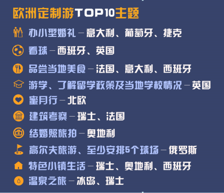 根据游客的定制需求单,十大欧洲定制游主题备受关注: 办小型婚礼、看球赛、品尝当地美食、游学、留学考察、蜜月行、建筑考察、结婚照旅拍、高尔夫旅游、特色小镇生活、温泉之旅。现在,携程欧洲定制游业务增长迅猛,已占出境定制游整体10%,近一年需求单量同比增长130%,花费平均在每人每天2500元,远高于整体市场增速。