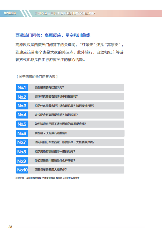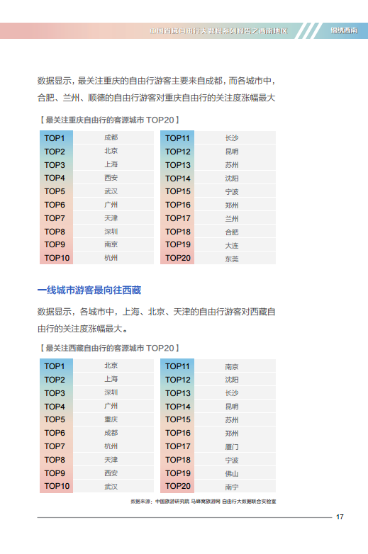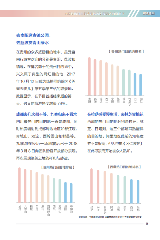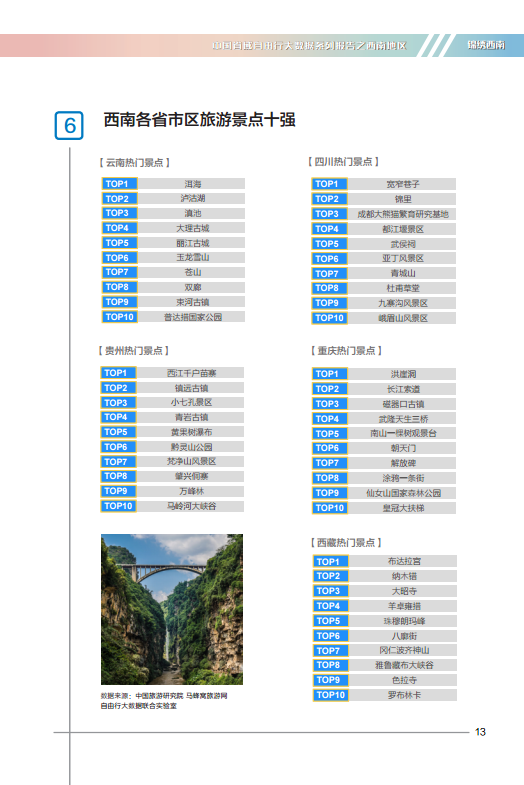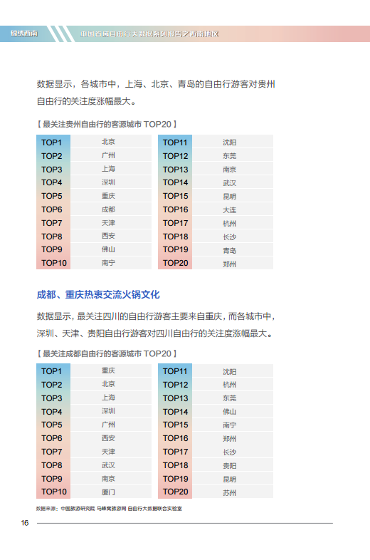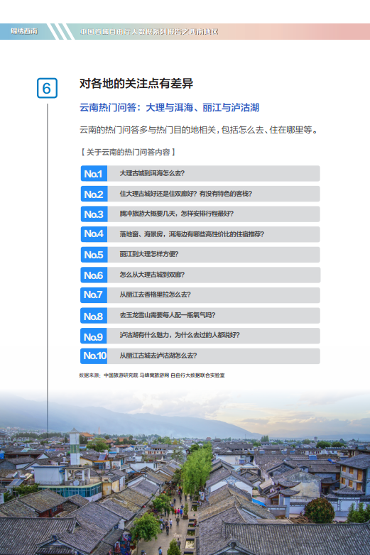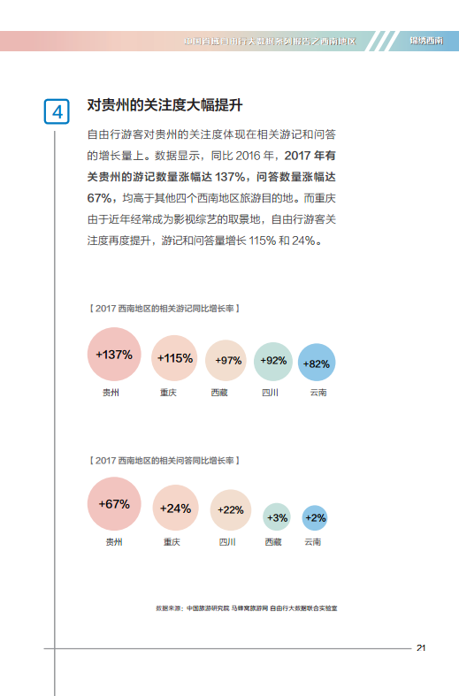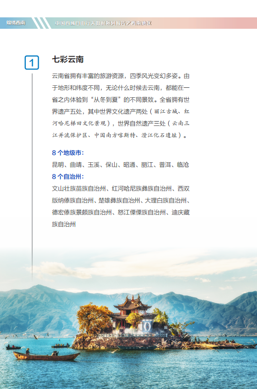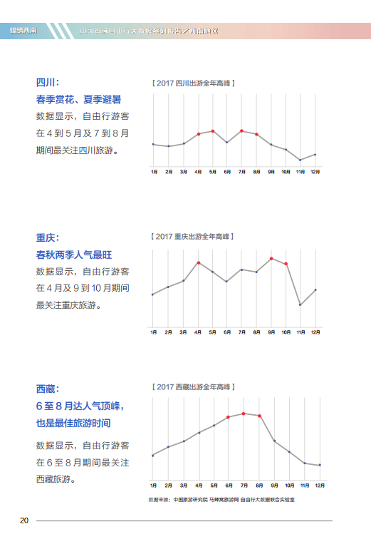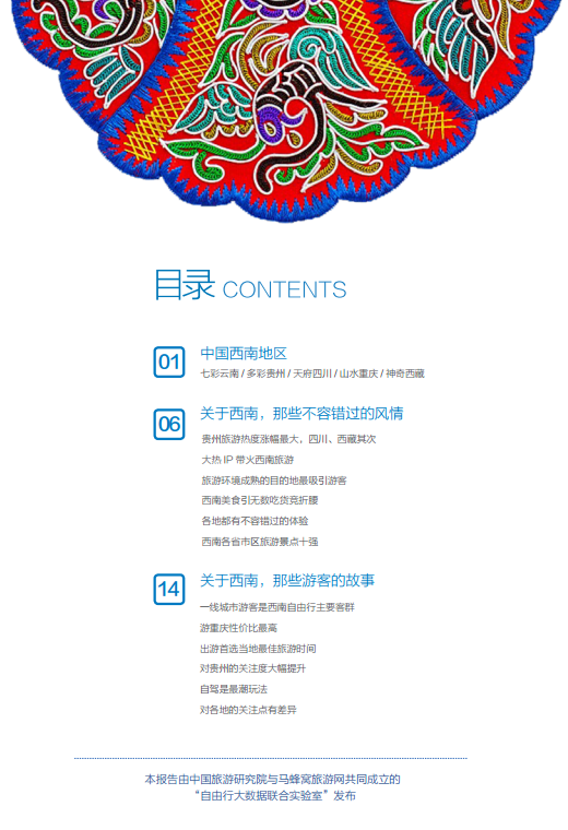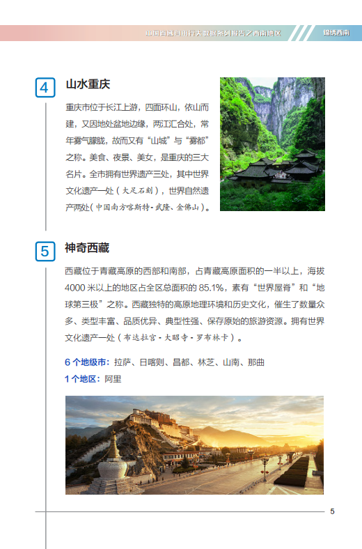 该报告以双方旅游大数据为基础,深度剖析了中国西南地区五省区市——云南、贵州、四川、重庆、西藏的旅游市场现状与未来开展趋势。报告显示,西南五省区市的旅游热度近年有大幅增长,自驾、古镇、美食成为西南地区最受旅行者关注的关键词。报告全文如下: