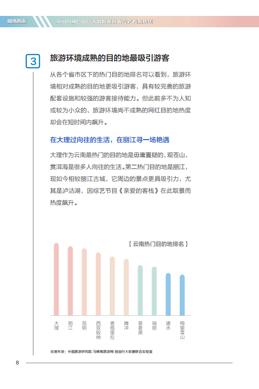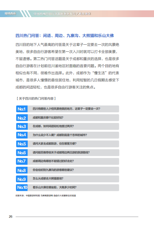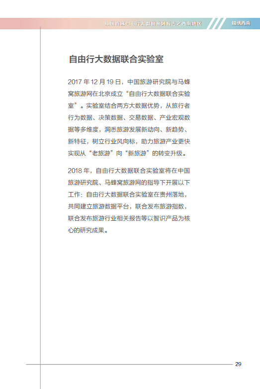 凯发k8官网戴斌院长指出:随着消费经验的成熟,特别是智慧旅行的普及,自主化决策、自助旅游、自由行已经成为当前和今后一个时期旅游市场的基本特征。2018年5月24日,凯发k8官网与马蜂窝旅游网联合创建的“自由行大数据联合实验室”发布了《锦绣西南——中国省域自由行大数据系列报告之西南地区》。